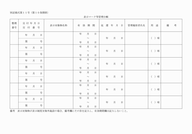 第10条 署長は,表示マーク等管理台帳(別記様式第11号)を作成するとともに,表示マーク交付(更新)申請書,表示制度対象外施設申請書,その他関係書類を整理保存するものとする。