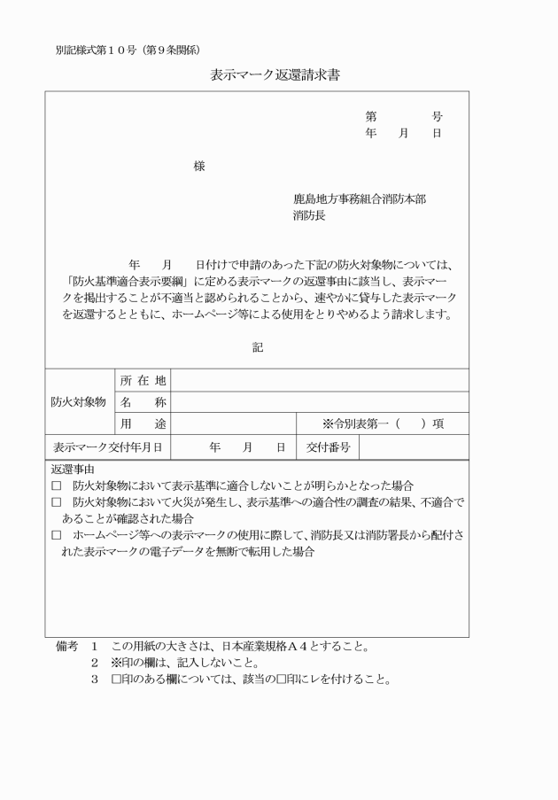 第9条 消防長は,表示マークの有効期間中にある防火対象物が表示要綱第8条第2項に規定する表示マークの返還事由に該当する場合,表示マークを交付した管理権原者に対し,表示マーク返還請求書(別記様式第10号)により,貸与していた表示マークの返還及びホームページ等での電子データの使用の中止を求めるものとする。