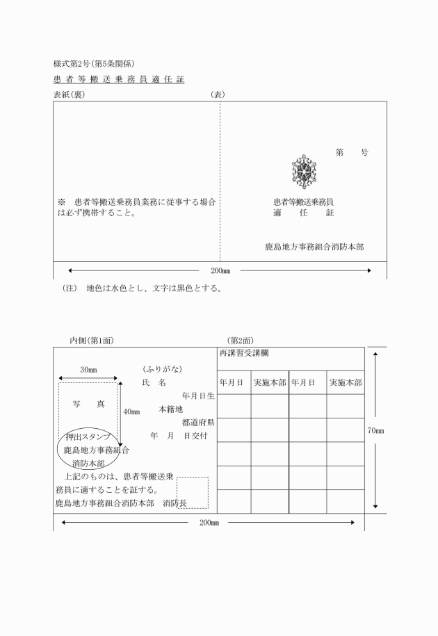 2 患者等搬送用自動車の乗務員は,消防機関が行う患者等搬送乗務員講習(以下「適任者講習」という。)別表第4に掲げる講習を修了した者で,患者等搬送業務適任証(様式第2号以下「適任証」という。)の交付を受けた者。