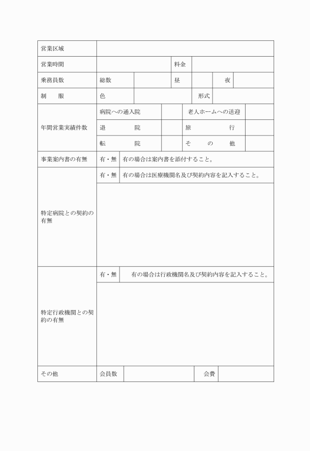 1 乗務員は,満18歳以上の者で,適任証の交付を受けているものであること。 2 患者等搬送用自動車1台につき,原則として乗務員2名以上の運行体制がとれること。 3 患者等搬送用自動車は,次に掲げる構造及び設備を有するものとする。 (1) 十分な緩衝装置を有するものであること。 (2) 換気及び冷暖房の装置を有するものであること。 (3) 乗務員が業務を実施するために必要なスペースを有するものであること。 (4) ストレッチャー及び車椅子等を確実に固定できる構造であること。 (5) 自動車電話又は無線等の通信連絡に必要な設備を有していること。 4 患者等搬送自動車の車体には,患者等搬送自動車である旨の表示がされていること。 5 患者等搬送自動車は,サイレン又は赤色灯を装備するなど救急自動車と紛らわしい外観をしていないこと。 6 患者等搬送自動車には,応急手当に必要な資器材を備えること。 7 消毒実施記録表が患者等搬送自動車の見易い場所に表示されていること。 8 乗務員の服装は,患者等搬送業務にふさわしいものとし,清潔さが保たれていること。 9 パンフレットその他これらに類するものに「緊急の業務」を行っていると市民等に誤解を与えるような表示はしていないこと。 10 道路運送法(昭和26年法律第183号)に定める国土交通大臣の免許等を取得していること。 |