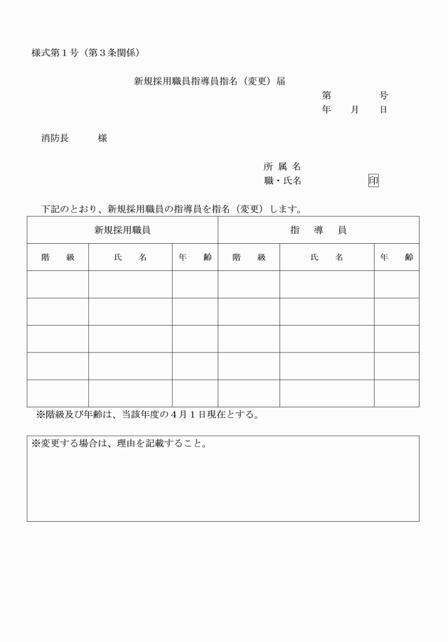 (2) 所属長は,指導員を指名した場合は,新規採用職員指導員指名(変更)届(様式第1号)により消防長へ報告するものとする。